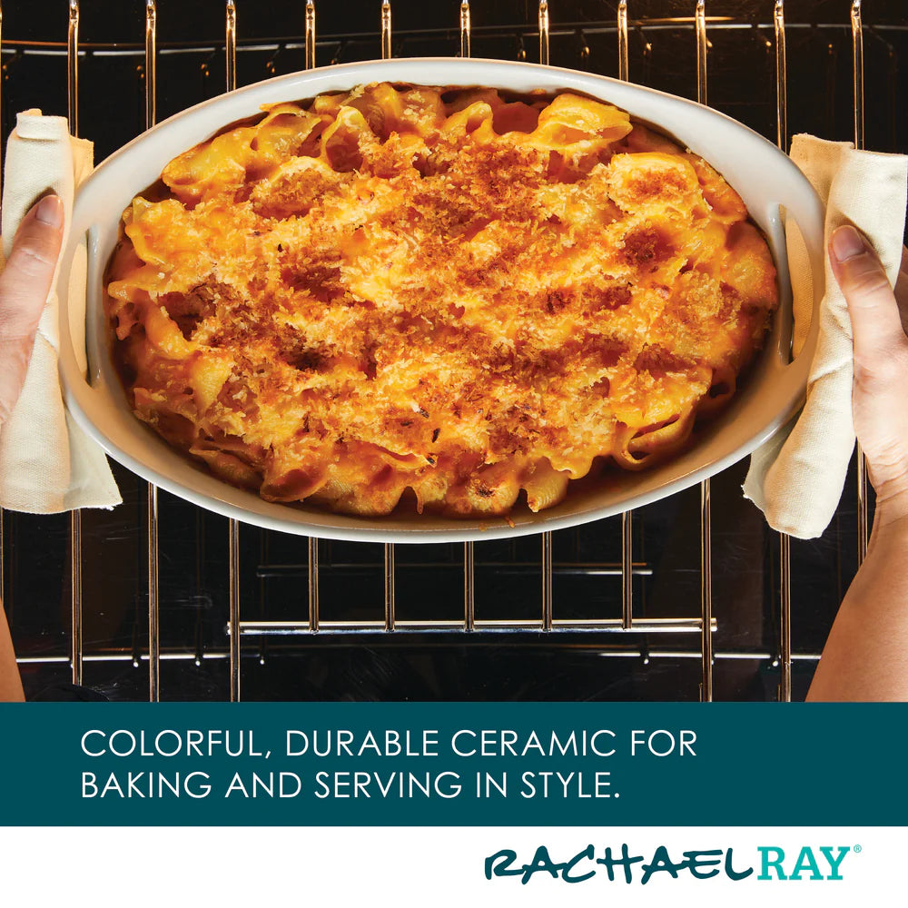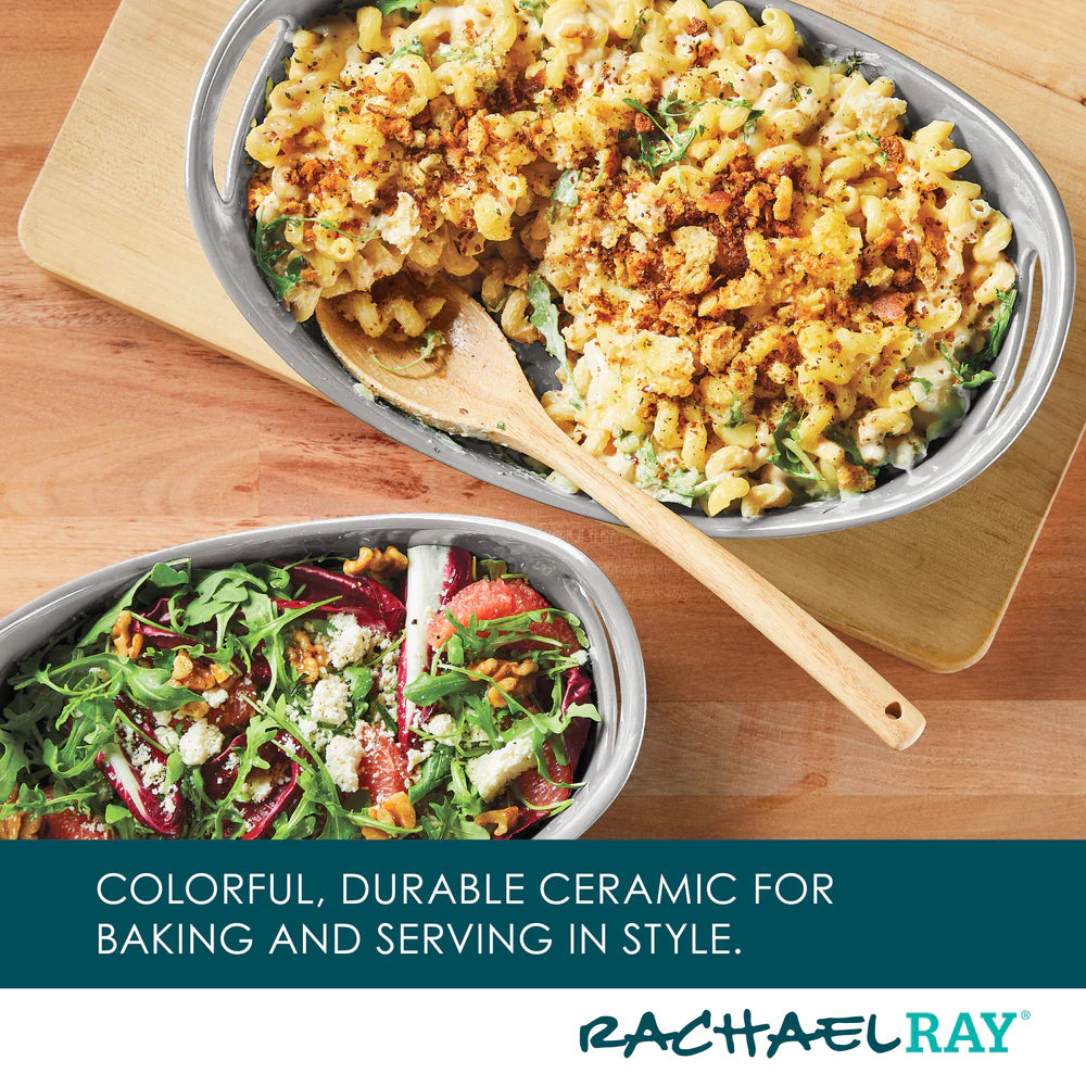 Bake and serve lasagna, rich mac and cheese, or an apple crumble with this versatile baking dish set Rachael calls the bubble & brown set. These non-porous, ceramic baking dishes are designed to be table ready for easy bake and serve dining. Microwave, freezer, and oven safe to 500°F, this set of bakers is also dishwasher safe for quick cleanup.