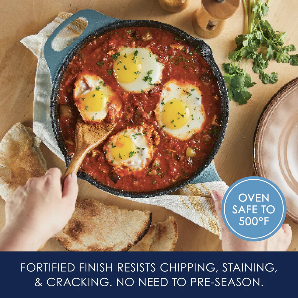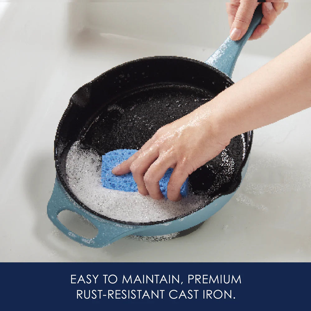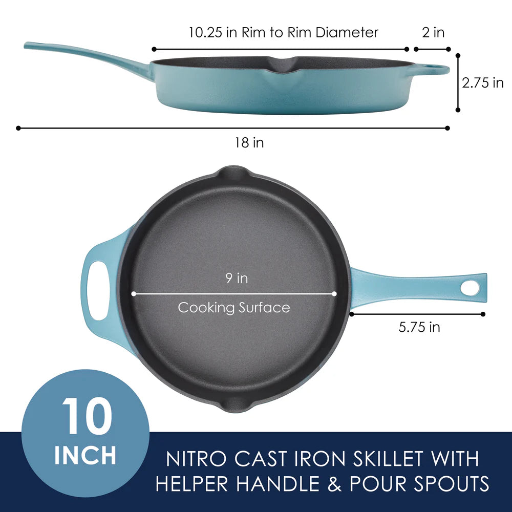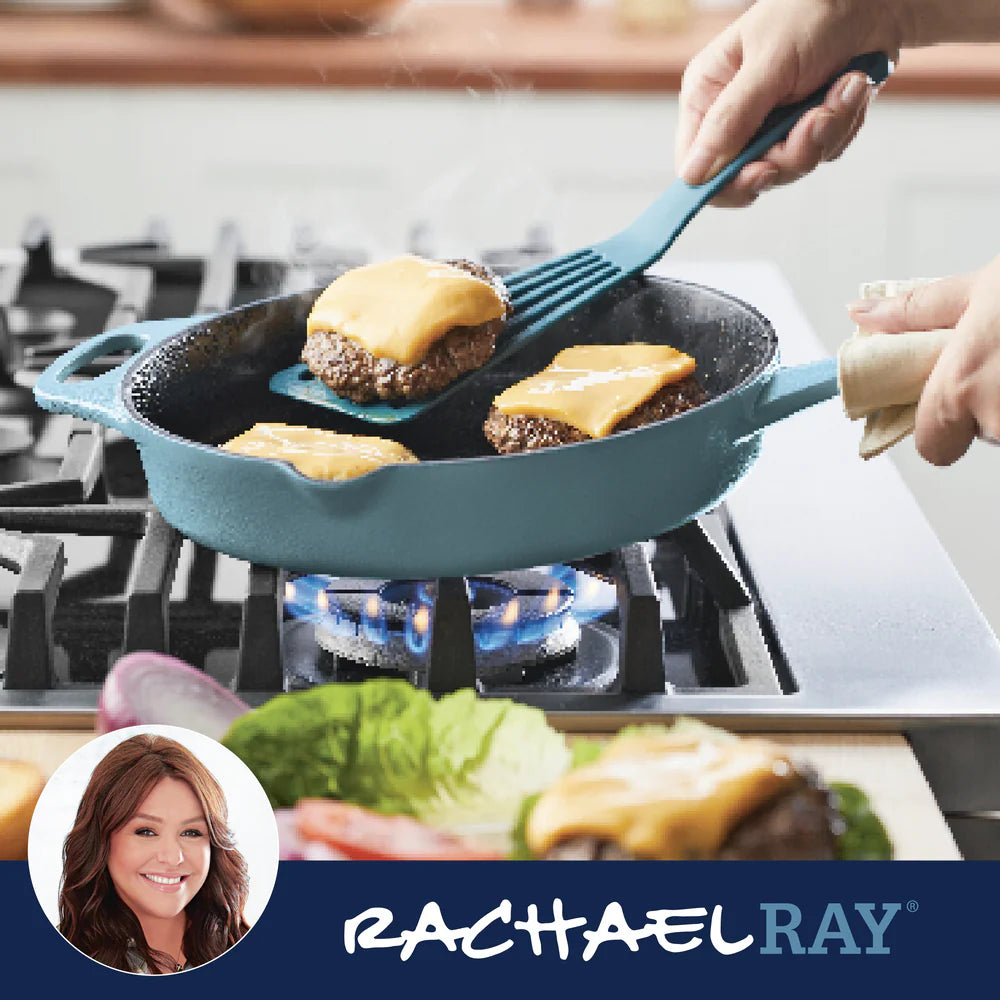 Meet your new kitchen hero! Get incredible cast iron performance that's easy to maintain with this Rachael Ray NITRO Cast Iron Skillet that delivers the classic durability and performance of cast iron without the hassle of complicated cleaning. A next-generation nitro heat treatment seals and smooths surfaces for amazing, easy-to-use, easy-to-clean cast iron that's fortified to resist rust, chipping, and staining. Wash it, scrub it, crank it up on the stovetop or in the oven! This amazing 10-inch cast iron frying pan features a helper handle for all of your stove-to-oven recipes and built-in spouts for easy pouring, and the satiny-smooth nitro finish holds brilliant colors to complement any kitchen. Oven safe to a ripping 500°F, induction capable and made to last a lifetime (and look great for a lifetime, too), this durable meal maker is pre-seasoned and ready to deliver. See why cast iron is one of Rachael's favorite ways to make meals even more delish.