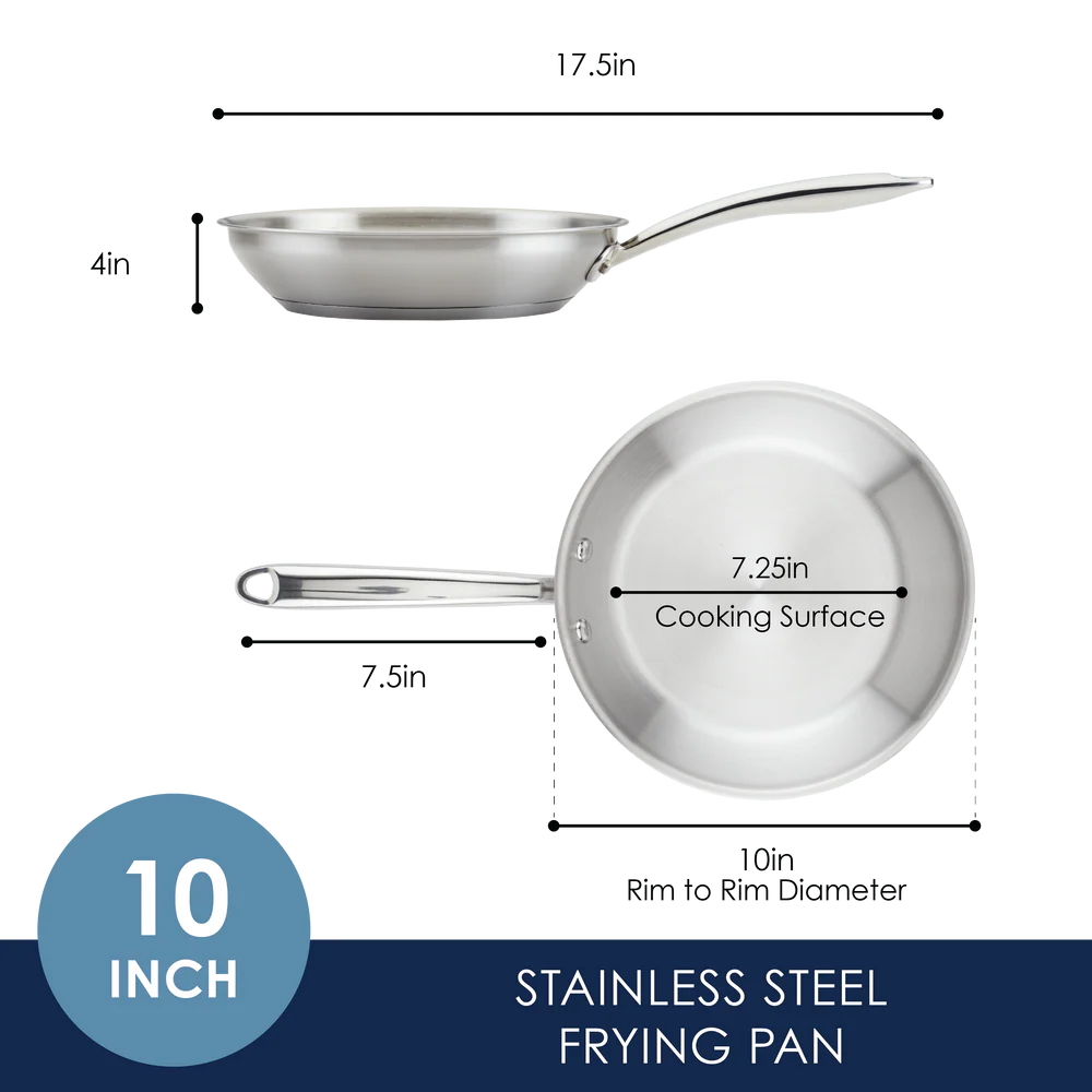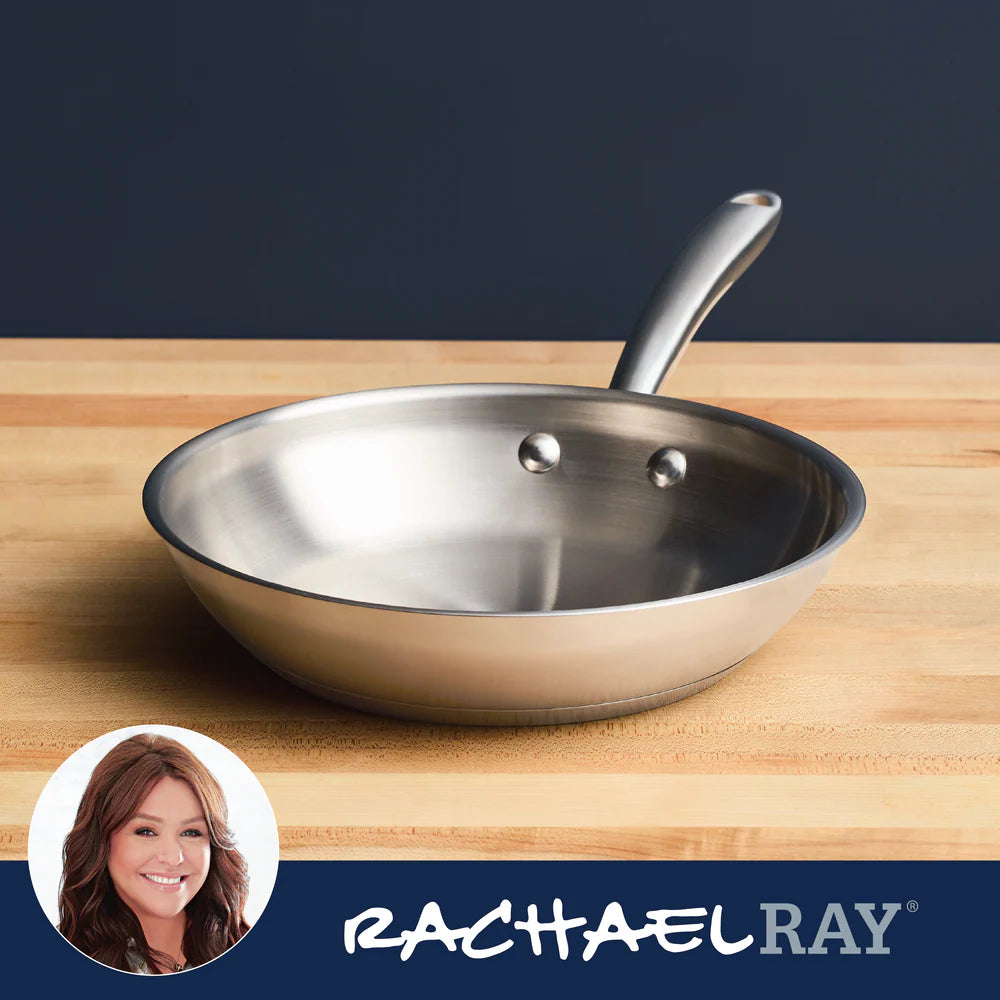 Bring flexibility and convenience into the kitchen with a classic stainless steel frying pan from Rachael Ray. Sizzle, sear, and simmer and take the guesswork out of recipes with the right cookware on hand. Built with durability and performance in mind, this versatile induction-suitable skillet maximizes results in the kitchen while making mealtime magic that brings people together. This pro-grade frypan delivers fast, even heat with dishwasher safe convenience. Double-riveted stainless steel handles for comfort and confidence when stirring, flipping, and sautéing and oven safe to 500° F for the perfect stove-to-oven finish.