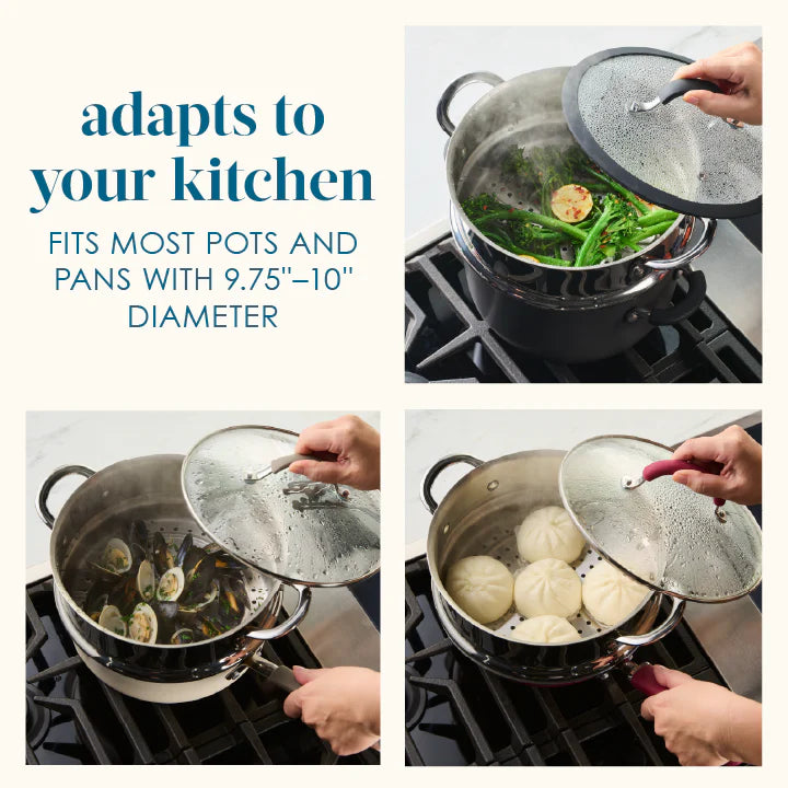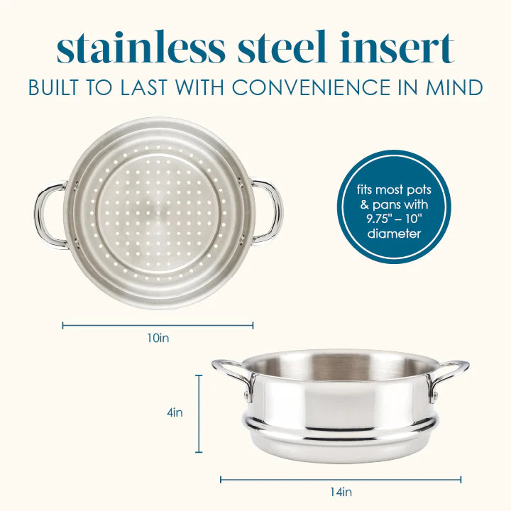Stainless Steel Steamer Insert fits any 3-quart saute pan from Rachael Ray (not just Cucina) and any pot or pan with a 10-inch diameter. Dishwasher safe and durable enough to match your creative energy in the kitchen.
