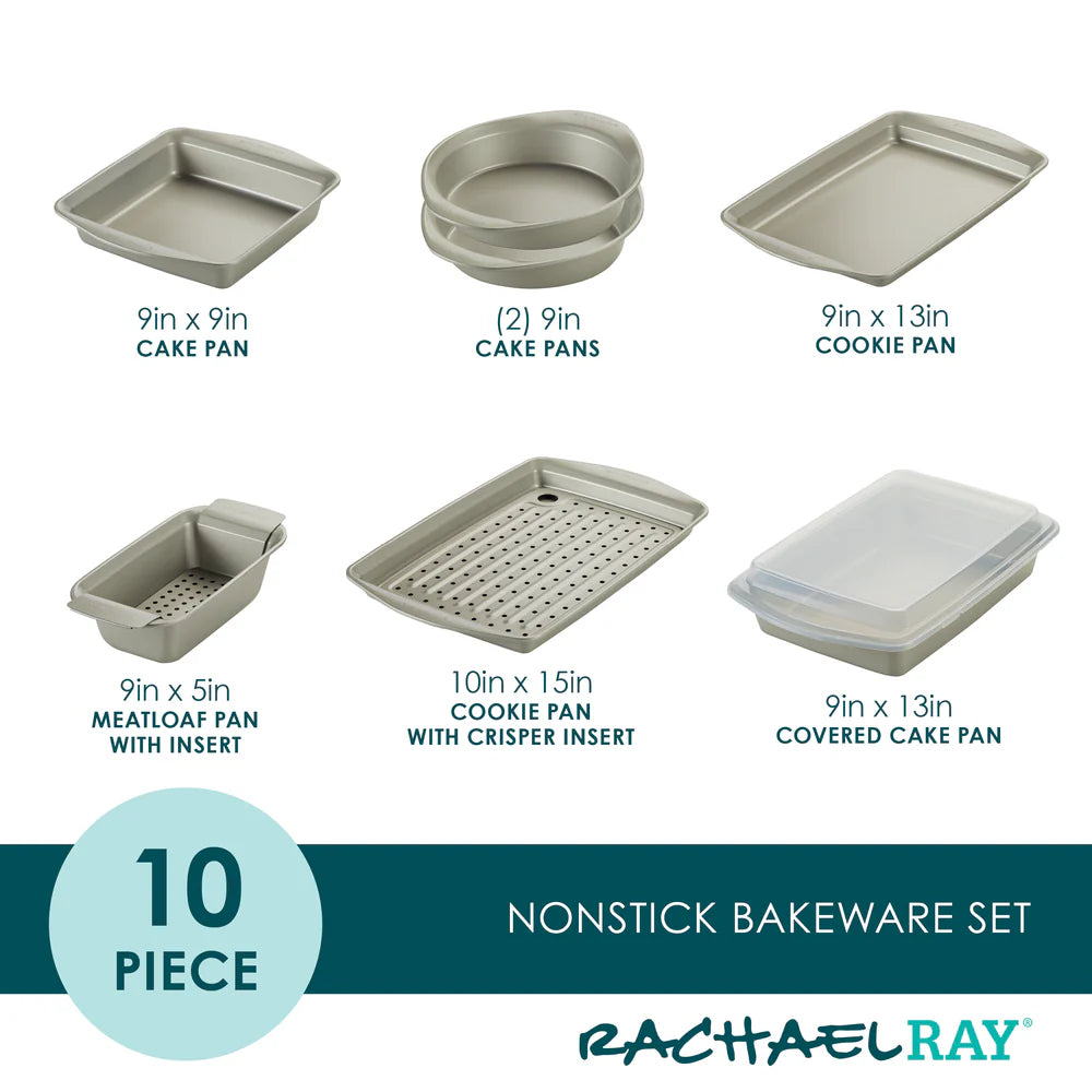 Set includes: 9-Inch x 13-Inch Covered Cake Pan, 10-Inch x 15-Inch Cookie Pan with Crisper Insert, Loaf Pan w/ Insert, Two 9-Inch Round Cake Pans, 9-Inch Square Cake Pan, 9-Inch x 13-Inch Cookie Pan