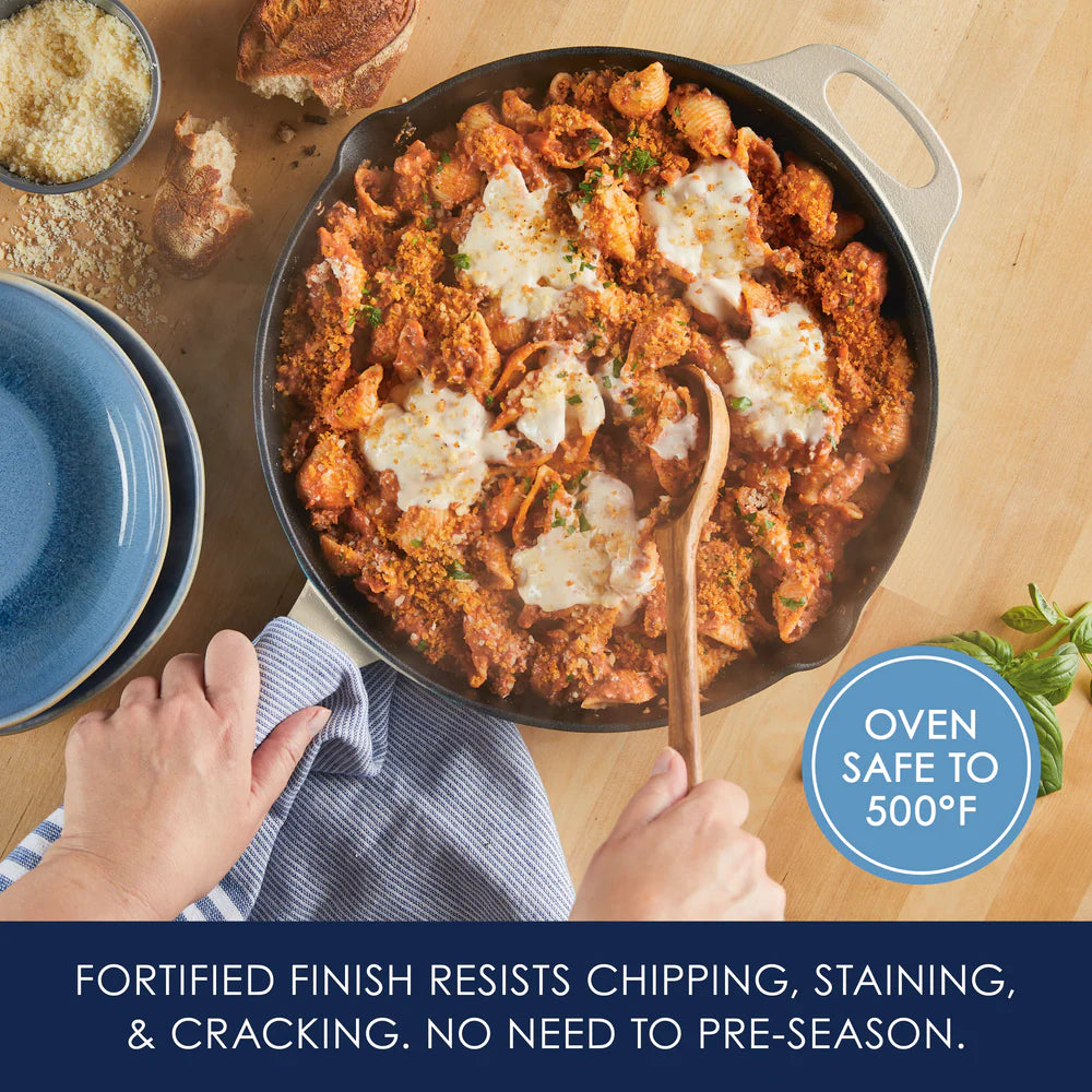 Meet your new kitchen hero! Get incredible cast iron performance that's easy to maintain with this Rachael Ray NITRO Cast Iron Skillet that delivers the classic durability and performance of cast iron without the hassle of complicated cleaning. A next-generation nitro heat treatment seals and smooths surfaces for amazing, easy-to-use, easy-to-clean cast iron that's fortified to resist rust, chipping, and staining. Wash it, scrub it, crank it up on the stovetop or in the oven! This extra roomy 12-inch cast iron frying pan features a helper handle for all of your stove-to-oven recipes and built-in spouts for easy pouring, and the satiny-smooth nitro finish holds brilliant colors to complement any kitchen. Oven safe to a ripping 500°F, induction capable and made to last a lifetime (and look great for a lifetime, too), this durable meal maker is pre-seasoned and ready to deliver. See why cast iron is one of Rachael's favorite ways to make meals even more delish.