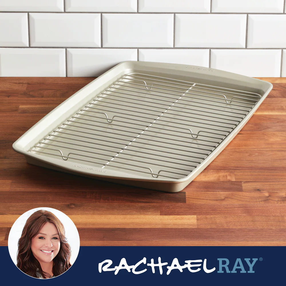 Go family-size with the hot wings and french fries with this jumbo nonstick cookie sheet and rack. Made from heavy gauge steel, this large cookie pan resists warping and features long-lasting nonstick to provide excellent food release. Oven safe to 450°F.