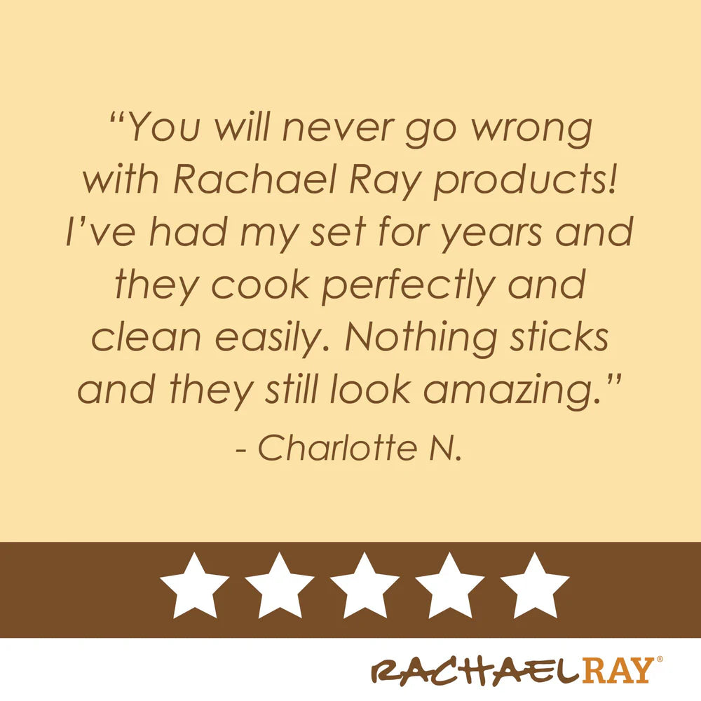 Crafted with stylish hard enamel exteriors, these high performance aluminum pots and pans promote fast, even heat with the easy-to-use functionality and time-saving solutions Rachael is known for. Color meets easy-clean convenience with the distinctive espresso-colored nonstick, handles are double riveted for extra strength, and shatter-resistant glass lids seal in heat and flavor. Oven safe to 400°F, the nonstick cookware comes complete with two nylon kitchen utensils and a set of BPA-free mix and measure cups. The nesting prep bowls fit together for easy storage, are top-rack dishwasher safe for easy cleanup, and include standard 1/4-cup, 1/3-cup, 1/2-cup and 1-cup sizes and extra big 3-cup and 2-cup sizes for measuring, too. How cool is that?
