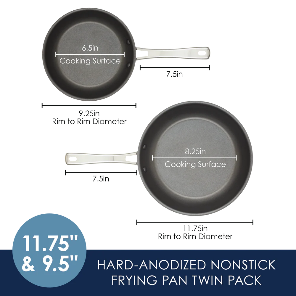 Level up your kitchen with these fun, super-functional frying pans crafted from thicker gauge hard-anodized aluminum for a luxe, sturdy feel. The sleek, on-trend design features a wider cooking surface and the skillets also feature nonstick on the inside rivets for super smooth, easy-clean cooking surfaces. Triple layer nonstick provides the ultimate performance in scratch resistance and durability.