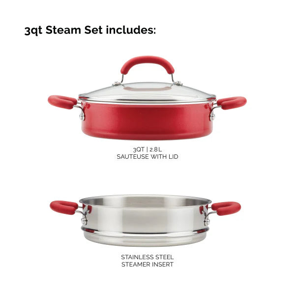 Steam your favorite veggies, tamales or cook pasta with this Rachael Ray steamer set. This generous saute pan is made from durable aluminum for quick, even heating and is finished with PlatinumShield nonstick reinforced to be 9x harder than titanium for effortless food release and easy cleanup.