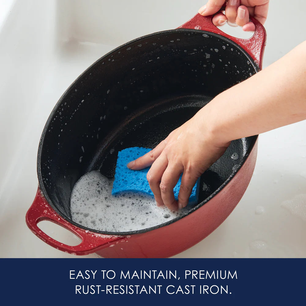 Meet your new kitchen hero! Get incredible cast iron performance that's easy to maintain with this Rachael Ray NITRO Cast Iron Dutch Oven that delivers the classic durability and performance of cast iron without the hassle of complicated cleaning. A next-generation nitro heat treatment seals and smooths surfaces for amazing, easy-to-use, easy-to-clean cast iron that's fortified to resist rust, chipping, and staining. Wash it, scrub it, crank it up on the stovetop or in the oven! This extra roomy 6.5-quart Dutch oven is recipe ready for braising, slow-cooking and amazing stove to oven to table recipes, and the satiny-smooth nitro finish holds brilliant colors to complement any kitchen. Oven safe to a ripping 500°F, induction capable and made to last a lifetime (and look great for a lifetime, too), this durable meal maker is pre-seasoned and ready to deliver. See why cast iron is one of Rachael's favorite ways to make meals even more delish.