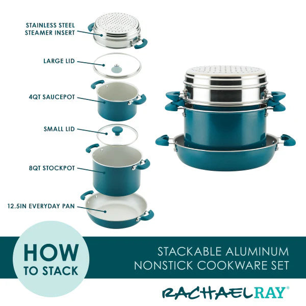 Save 55% more cabinet space with the solution-driven convenience of this stackable cookware set. The pot and pans are finished with PlatinumShield Technology nonstick reinforced to be 9 times harder than titanium for effortless food release and easy cleanup. Induction-compatible bases are oven safe to 400°F.