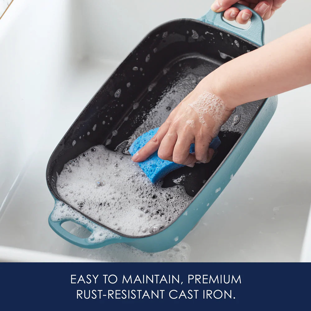 Meet your new kitchen hero! Get incredible cast iron performance that's easy to maintain with this Rachael Ray NITRO Cast Iron Roasting Pan that delivers the classic durability and performance of cast iron without the hassle of complicated cleaning, making this 9-inch x 13-inch meal maker ideal for use as a lasagna pan, casserole pan, or roaster. A next-generation nitro heat treatment seals and smooths surfaces for amazing, easy-to-use, easy-to-clean cast iron that's fortified to resist rust, chipping, and staining but still holds brilliant colors to complement any kitchen style. Oven safe to a ripping 500°F, induction capable and made to last a lifetime (and look great for a lifetime, too), this durable cast iron roasting pan is pre-seasoned and ready to deliver. See why cast iron is one of Rachael's favorite ways to make meals even more delish.